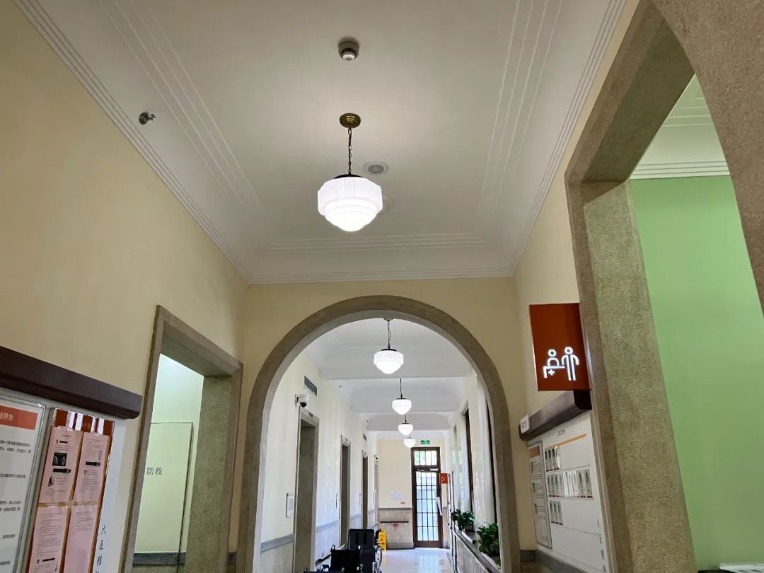推窗见绿、廊下有风,阳光打在建筑外墙上,闪亮如明灿星河,这是洗石子工艺特有的视觉效果。第一康复院内的2号、3号楼,作为修缮项目中的一期工程已经顺利竣工并投入使用,目前作为医院的康复病房。