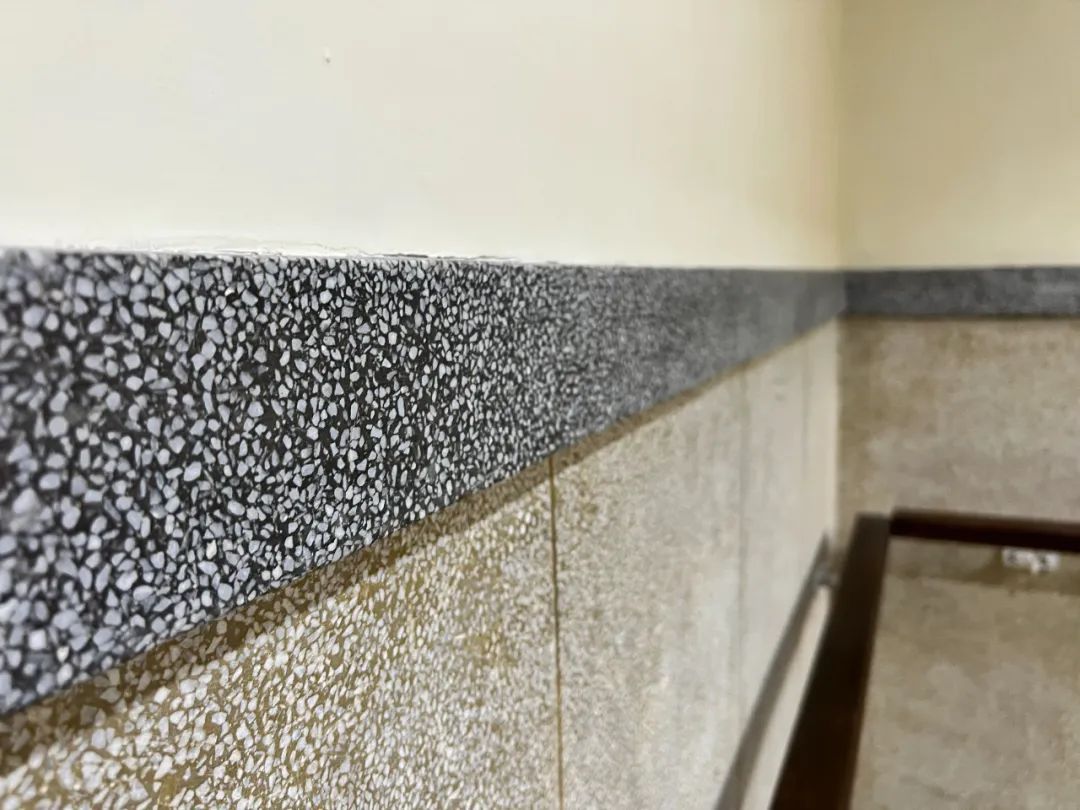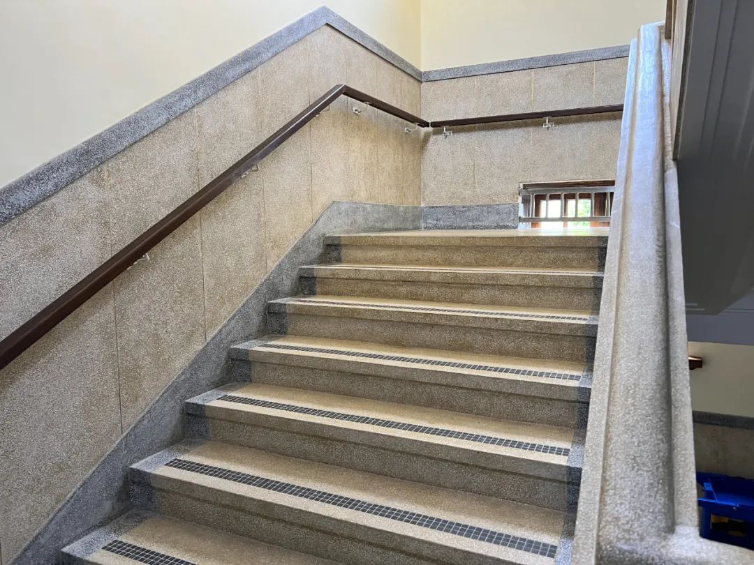 为了尽最大程度还原老建筑的原有风貌,在修缮过程中,人力和时间成本是成倍增加的。比如一个2层的楼梯间,用现代工艺的瓷砖和机械化手段,两到三天就可以完成修缮恢复了。而按照传统水磨石工艺就要耗时两周的时间。