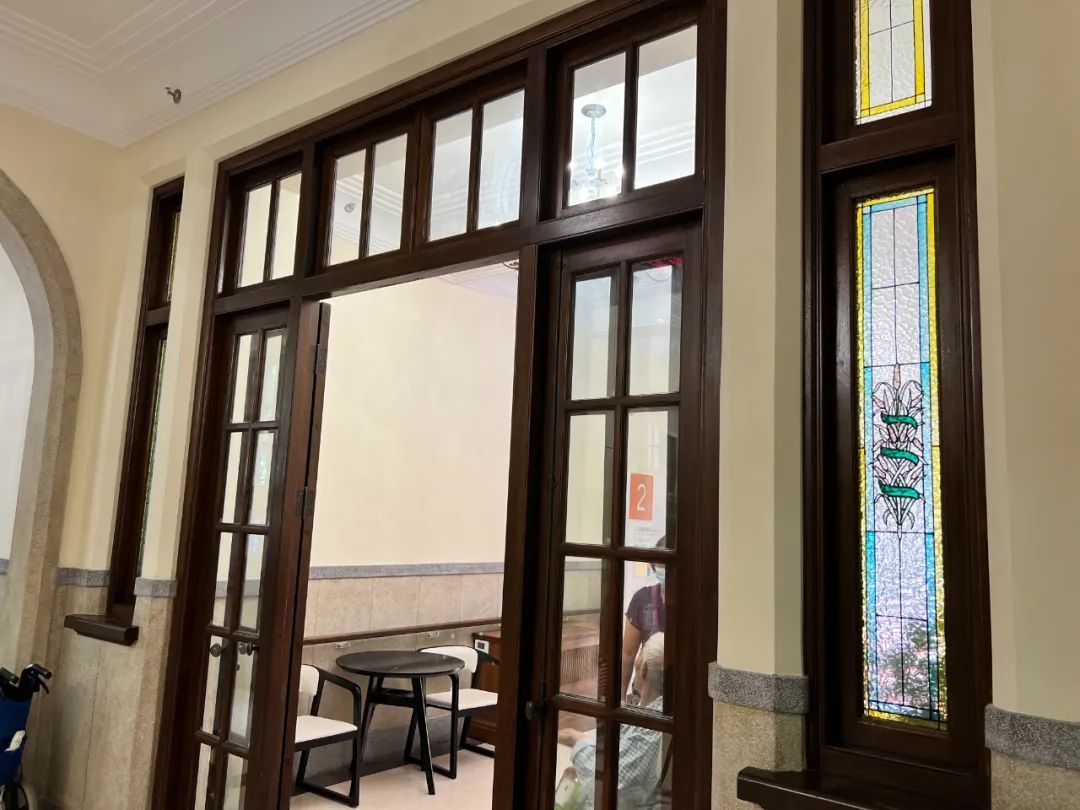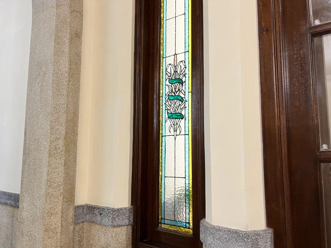 穿过门厅,老建筑的质朴气息就扑面而来。入眼的两扇彩绘玻璃表面凹凸有致,色彩饱满颇有匠心底蕴,这是根据建筑图纸量身定制打造的。
