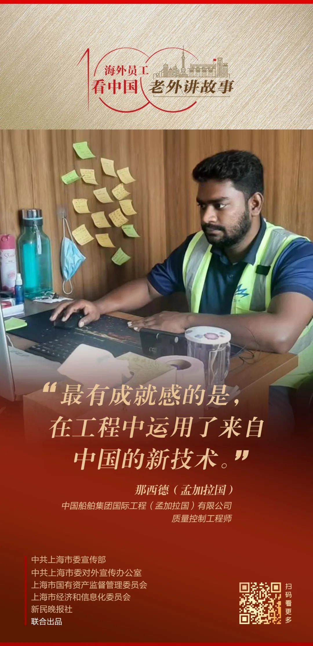 由中共上海市委宣传部、中共上海市委对外宣传办公室、上海市国有资产监督管理委员会、上海市经济和信息化委员会、新民晚报社联合出品的《老外讲故事•海外员工看中国》百集融媒体产品最新推出内容,中国船舶集团国际工程(孟加拉国)有限公司质量控制工程师那西德·帕尔维斯,上海实业环境控股有限公司行政、投资者关系部高级行政助理徐鸣莉与上海港湾集团泰国子公司行政经理雷观帖讲述自己身处中国企业、观察中国的真实感受。详见↓
