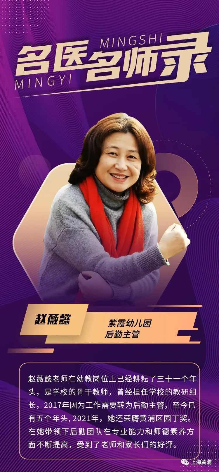 赵薇懿老师在幼教岗位上已经耕耘了三十一个年头,是学校的骨干教师,曾经担任学校的教研组长,2017年因为工作需要转为后勤主管,至今已有五个年头,2021年,她还荣膺黄浦区园丁奖。在她带领下后勤团队在专业能力和师德素养方面不断提高,受到了老师和家长们的好评,近两年后勤团队连续两次被评为校文明班组称号。