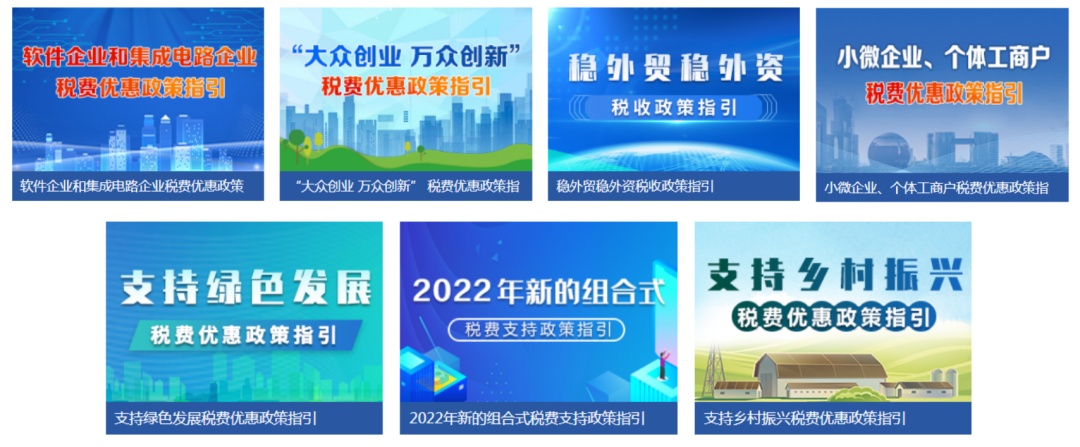 今年党中央、国务院部署实施新的组合式税费支持政策,对稳定市场预期、提振市场信心、助力企业纾困发展具有重要意义。为进一步落实好税费优惠政策助力高质量发展,税务总局发布《2022年新的组合式税费支持政策指引》和《“大众创业 万众创新”税费优惠政策指引》《小微企业、个体工商户税费优惠政策指引》《软件企业和集成电路企业税费优惠政策指引》《支持乡村振兴税费优惠政策指引》以及《支持绿色发展税费优惠政策指引》《稳外贸稳外资税收政策指引》(以上统称《指引》)。