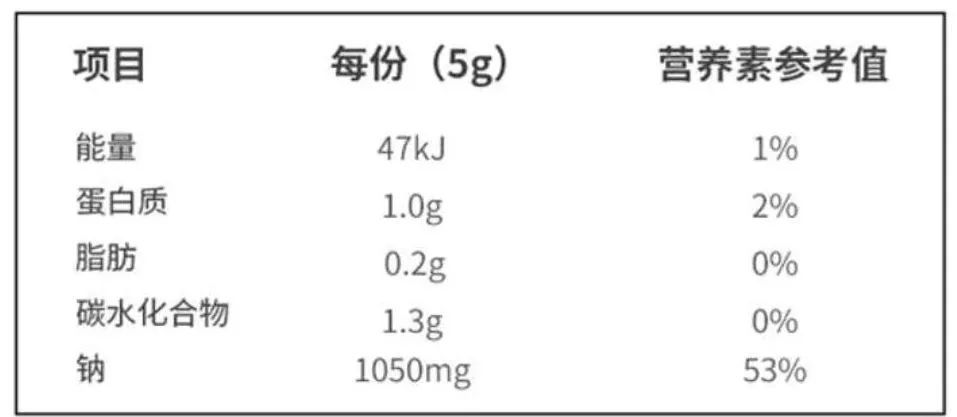 以下列某品牌鸡精的营养成分表为例,其中,每5克鸡精中就包含了1050毫克的钠。