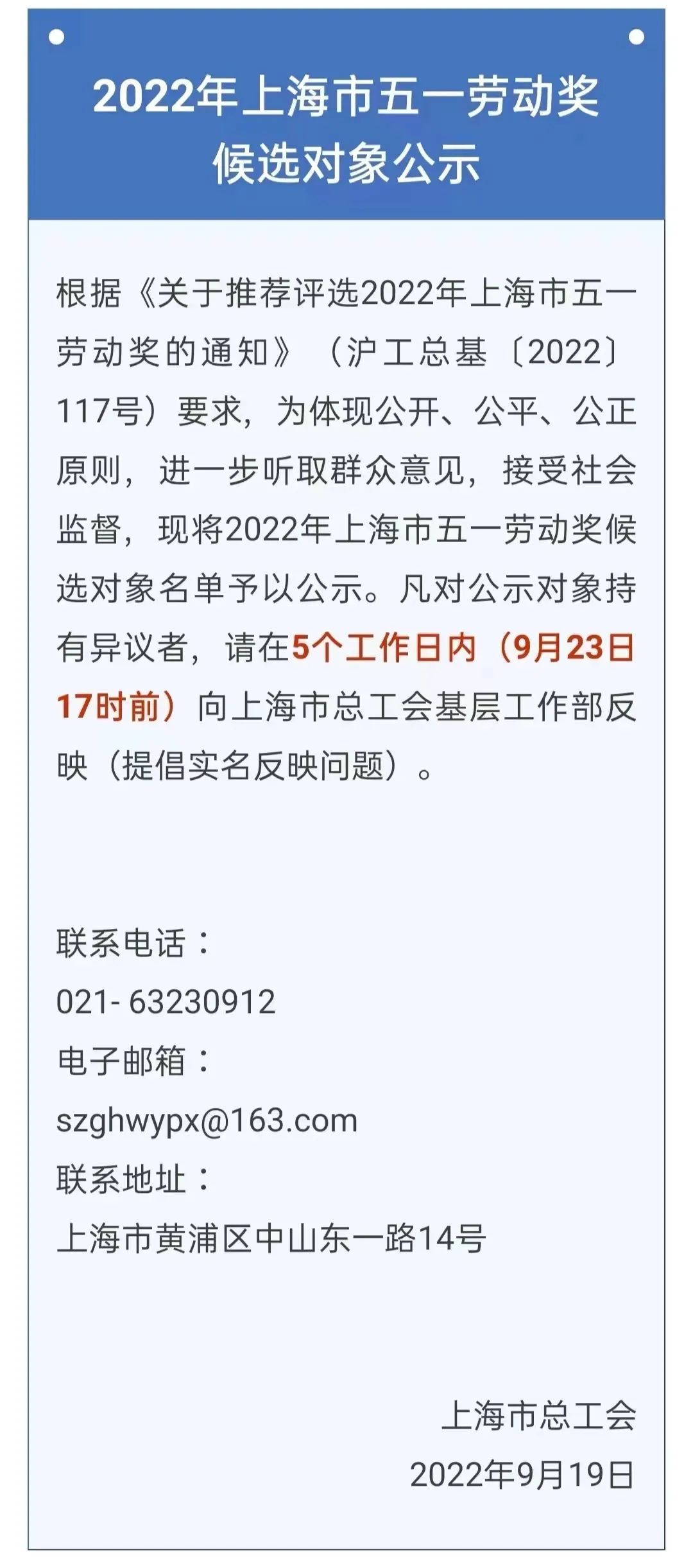 2022年上海市五一劳动奖状公示名单