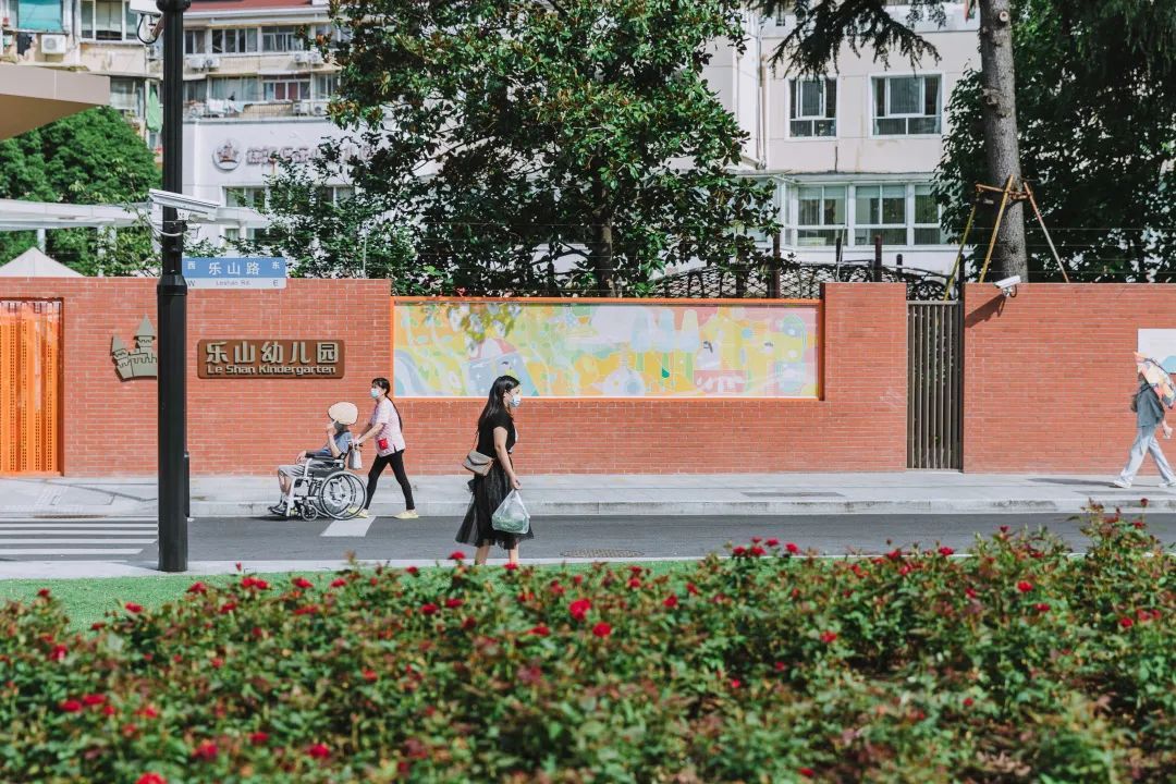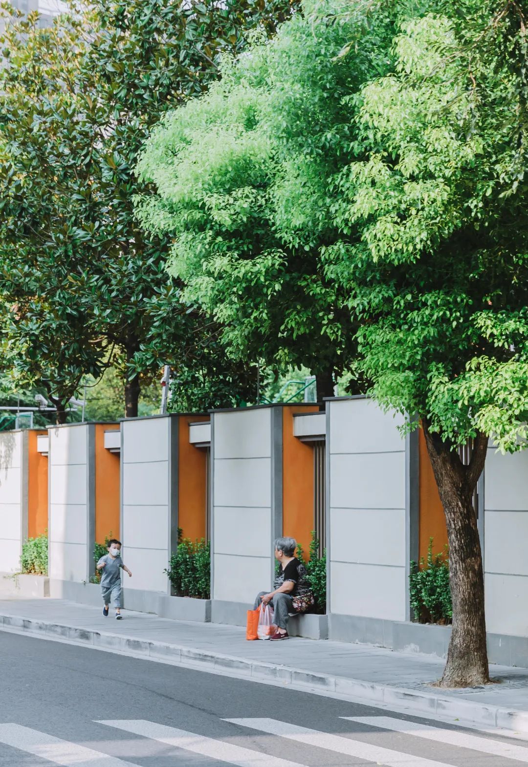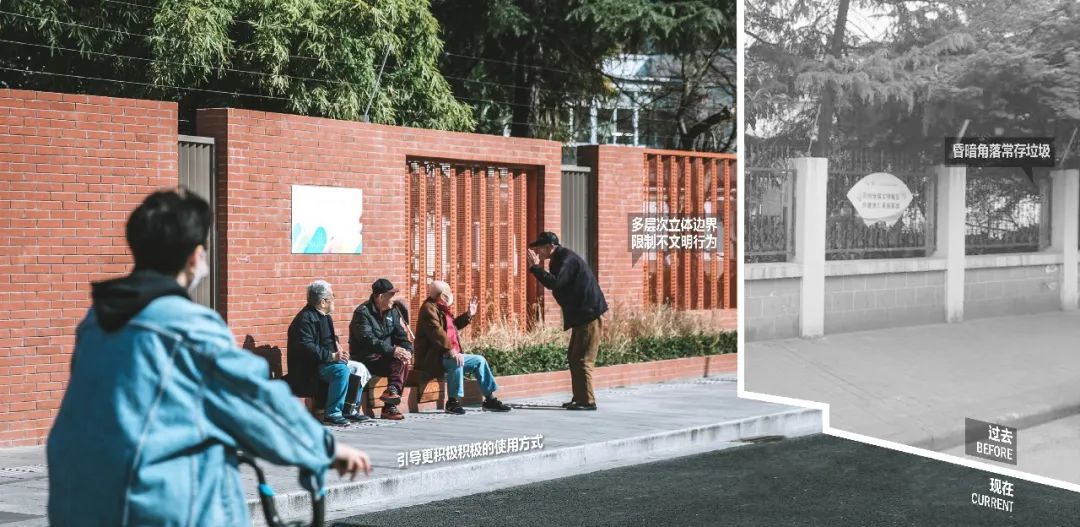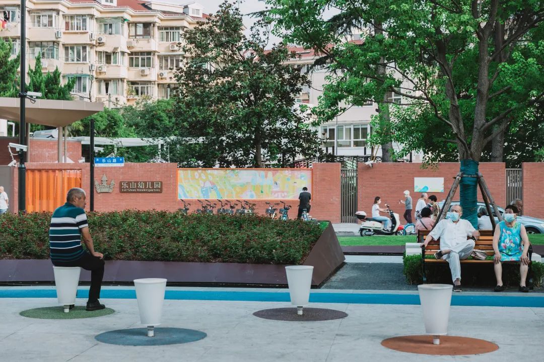 乐山幼儿园围墙的微调为老人们留出了晒太阳的座椅,又用景观的方式解决了隔墙抛物的问题。