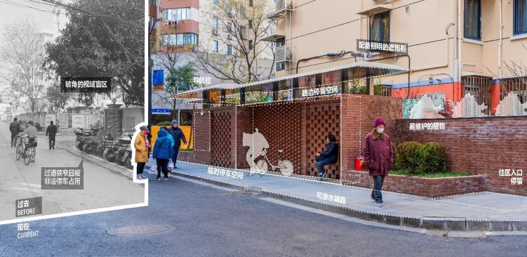 在社区规划师与交通顾问的建议下,街道启用了新的管理措施限制街边停车的数量。而设计团队则提出:打开每个街角,将视线隐蔽的角落变成公共交流场所,让更多的眼睛关注到这里,就能减少不文明行为的发生。