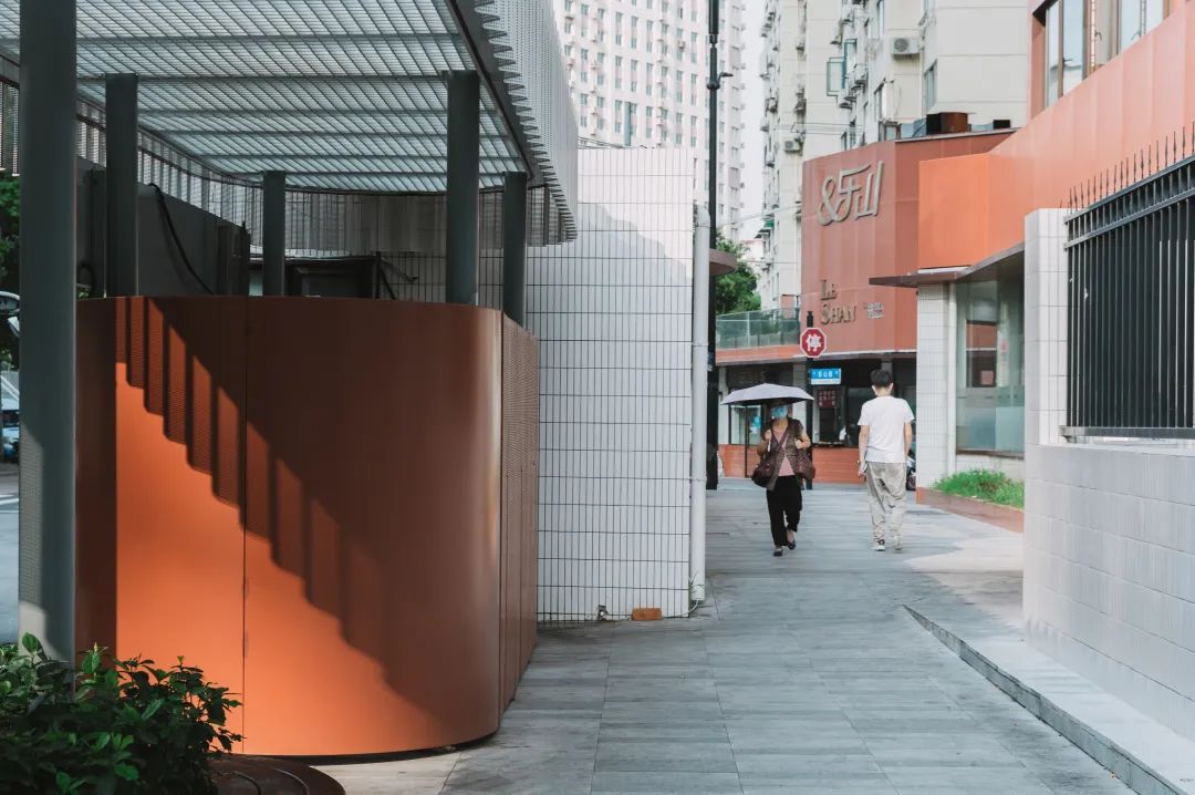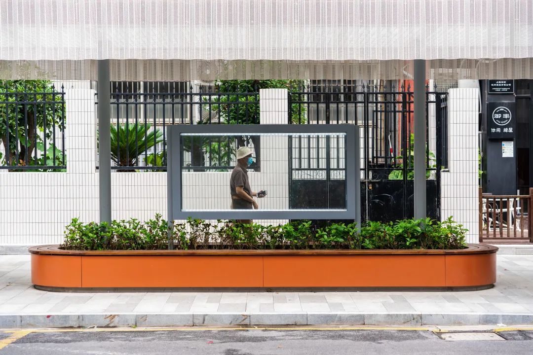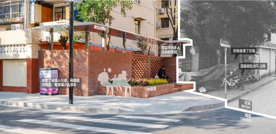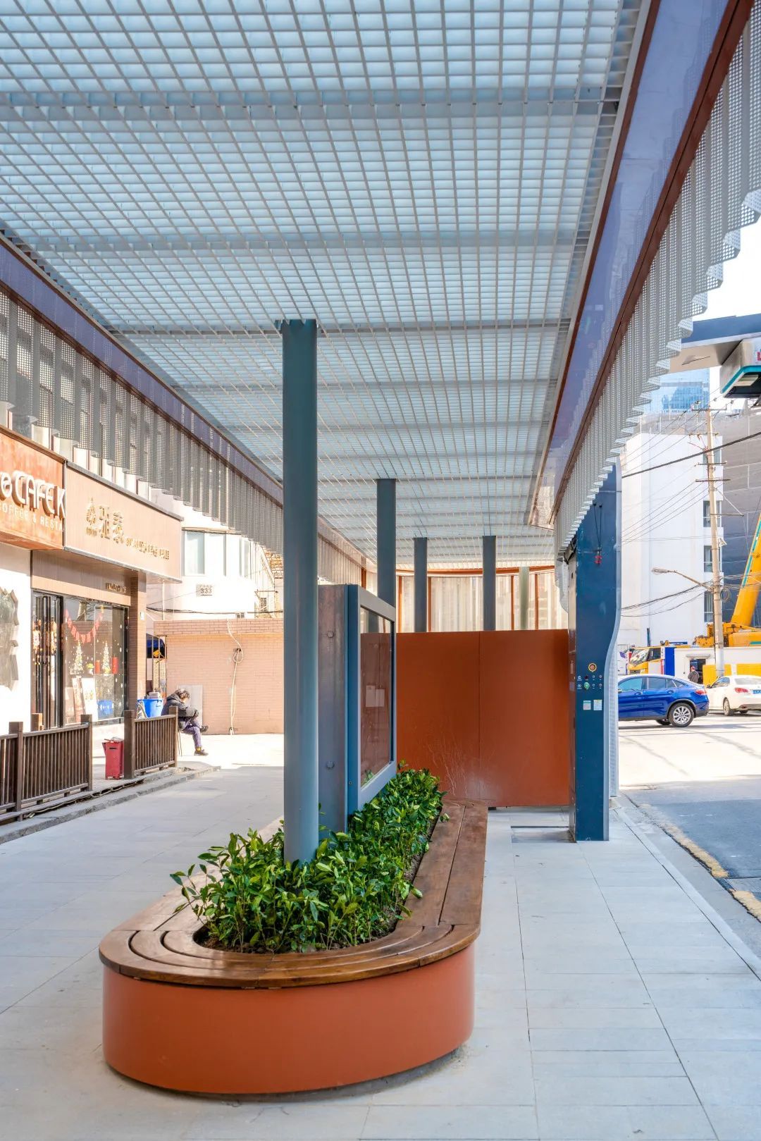 街角融入了花坛、座椅与雨篷,拓宽了行走的宽度,同时留下了邻里间交流的空间。