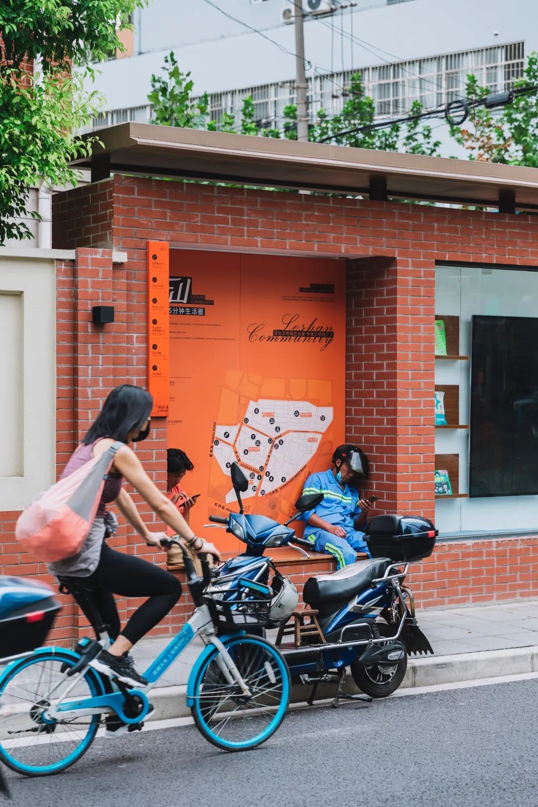 乐山社区通过整体视觉设计塑造街区形象。街区导视系统是乐山社区视觉设计中的重要组成部分,视觉团队将乐山社区的公共服务设施精心编撰到指引地图上,并在每一个转角设置了指引标牌。统一的街区VI与橙色标识设计也构成了街道上连续的视觉线索。