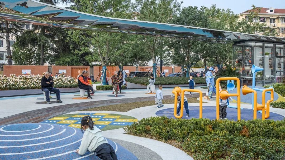 为了满足全龄人群的需要,绿地中设置了儿童趣乐场、攀岩墙以及跳格子、传音筒等游乐设施;新增体育健身设施,环形的健身步道还可以通过扫码进行健身数据的统计;中心的半围合区域是一处旱地喷泉,又是一个开放剧场,也可用作各类运动场地。