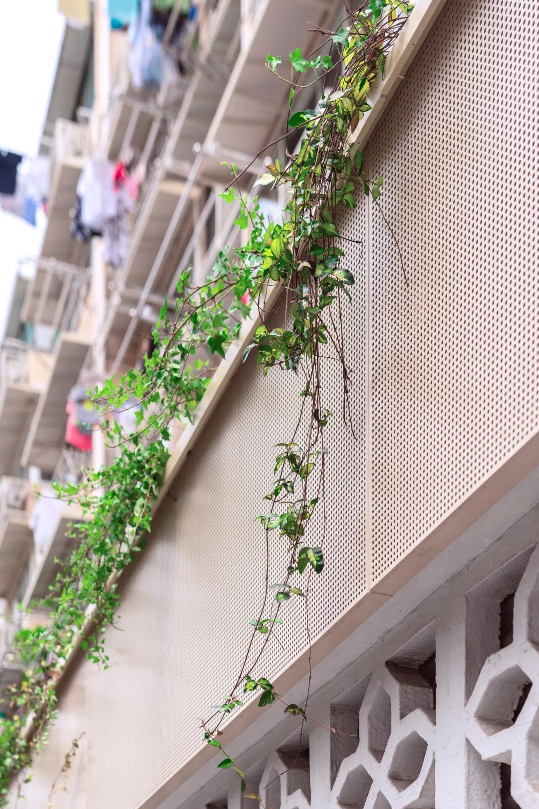 小区围墙的墙头改造成可盛纳绿植的花槽。