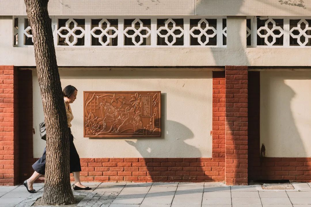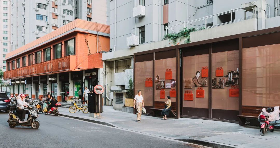 另一种“阅读街道”的体验是通过表现街区文化来实现的。设计团队与街道共同策划了”街区美术馆“,把徐家汇地区发展的人文资料形象地呈现在各个节点与慢行动线上。这其中包含了多个以徐家汇地区的艺术、名人、儿童画为主题的创作,还有一组由六十多块展板构成的“海派之源”人文展墙。改造后,许多居民和孩子们喜欢在这些展板前徘徊与阅读。
