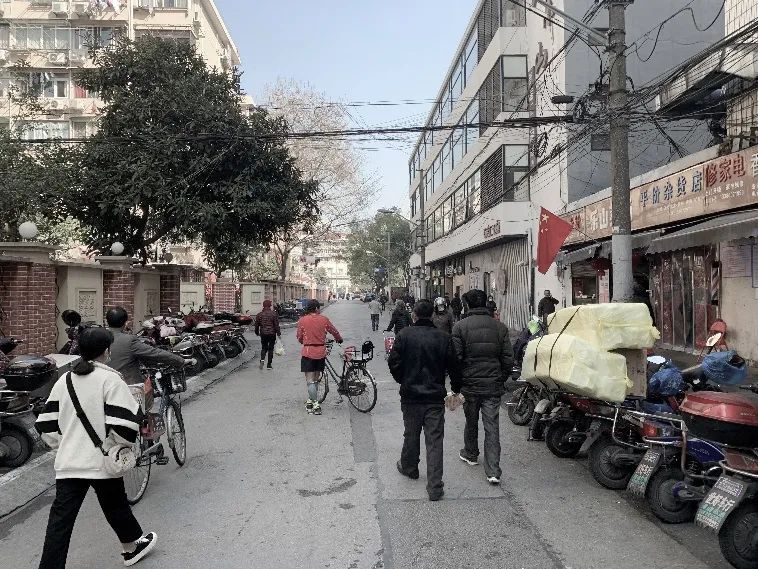 道路是乐山新村居民最日常的户外社交空间。改造之前,狭窄的人行道上既有乱堆放的非机动车,也有居民晒太阳时坐的凳子,还有老人们唠嗑间留下的垃圾,让街道管理团队很是头疼。