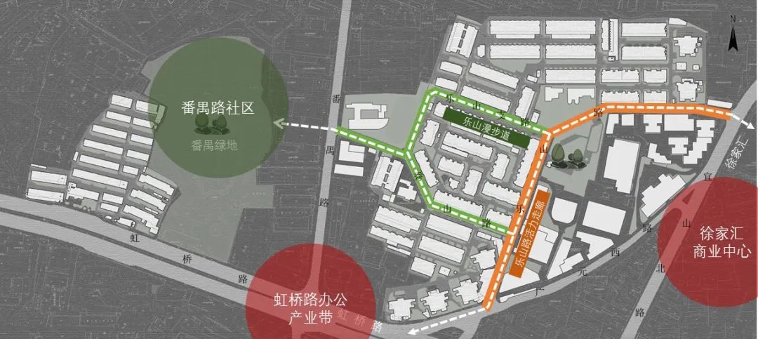 在与街道及区相关部门的讨论中,乐山社区的成长契机逐渐清晰:随着徐家汇的建设以世界一流CBD中心为目标,其毗邻社区的人口结构也正在发生变化;更多企业与商业的入驻带来大量年轻的工作人群与到访游客,乐山路已成为服务于徐家汇的综合型服务性街道。这里需要兼顾社区内与社区外的人群需求,需要补充与周边城市发展相匹配的服务、商业与空间配套,打造更有品质的城市公共生活形态与公共空间。