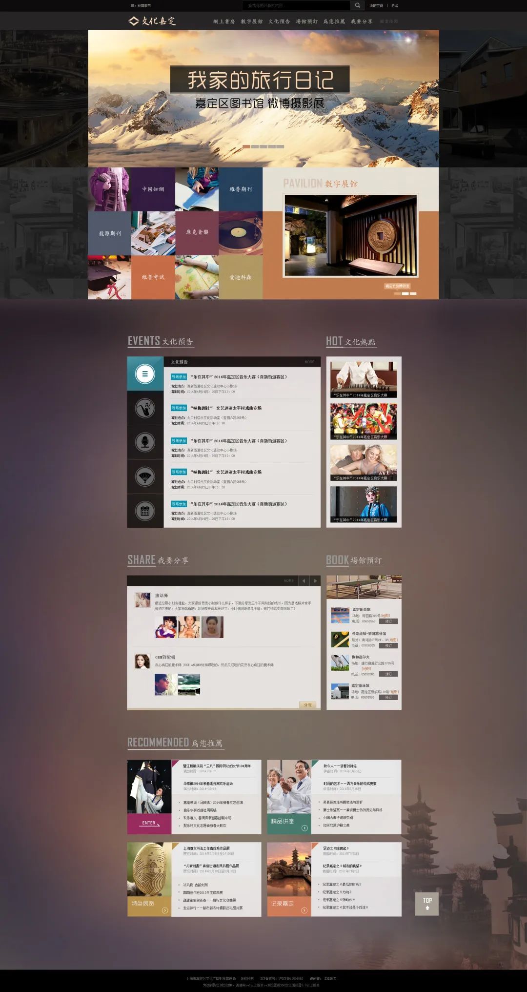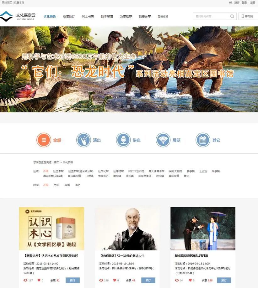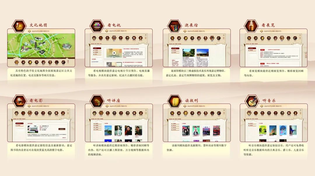 它较早地实践了“一站式服务”的理论,首度将嘉定区内图书馆、文化馆、博物馆、美术馆及十二个街镇社区文化活动中心的公共文化资源进行整合,统一“晒”到网上,提供文化活动预订、文化场馆预约、数据库浏览、展馆漫游等体验。