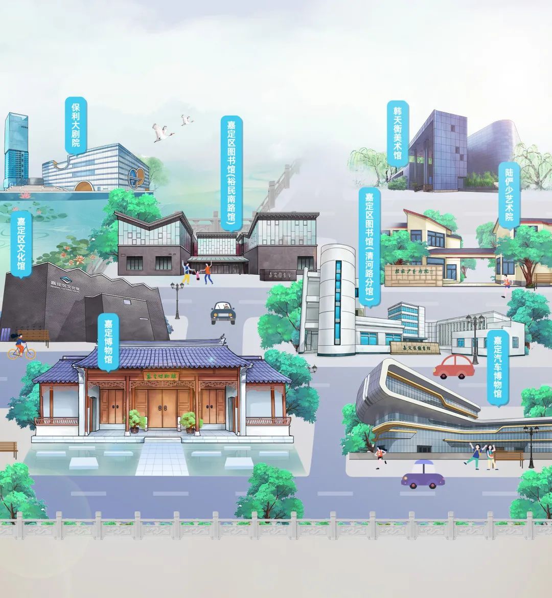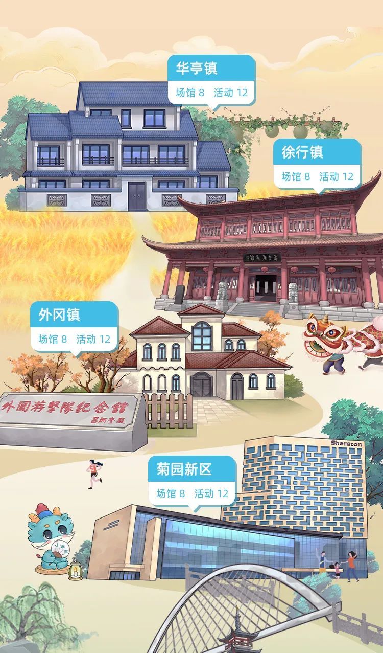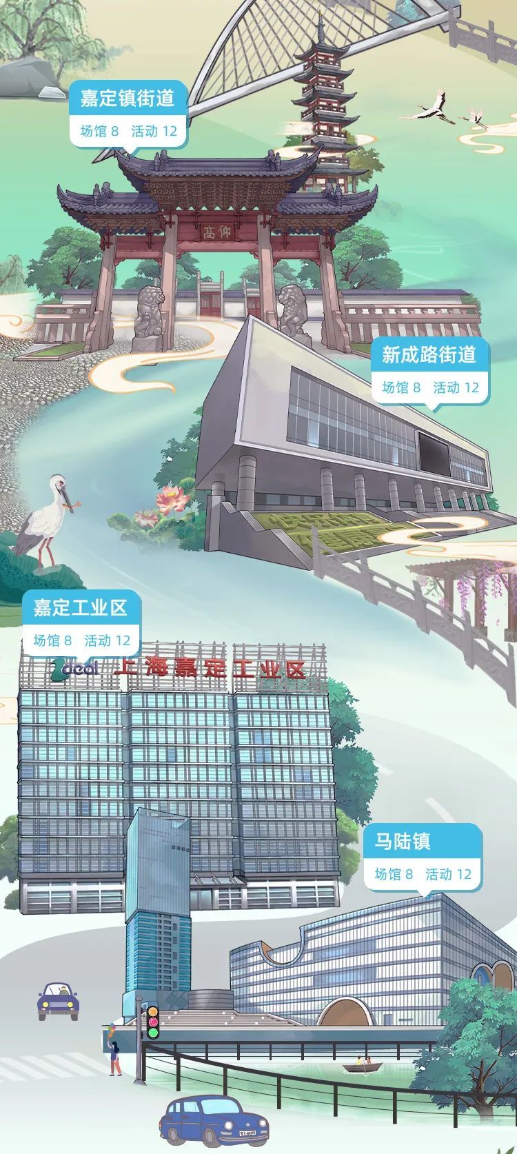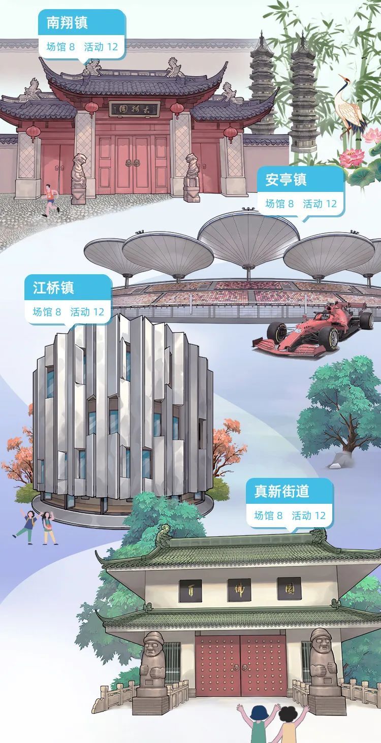 精致的手绘风页面有趣、形象、生动地展示了嘉定南北各个区域的特色文旅场景,有建筑可阅读,也有非遗新体验。同时,精致收罗全区7座特色文化空间、8大主要旅游景点景区、54个公共文化场馆,以及不断扩充的商圈、酒店和文化打卡点。