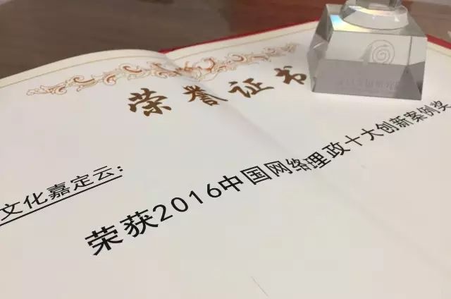 2016年12月,文化嘉定云在第四届(复旦大学)传播与国家治理论坛上获评“中国网络理政十大创新案例”奖。