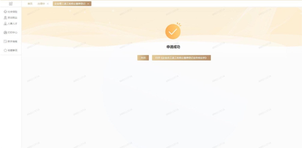 1.对于同时符合退工和停止缴费条件的,界面显示“申请成功”,可当场打印核定表。