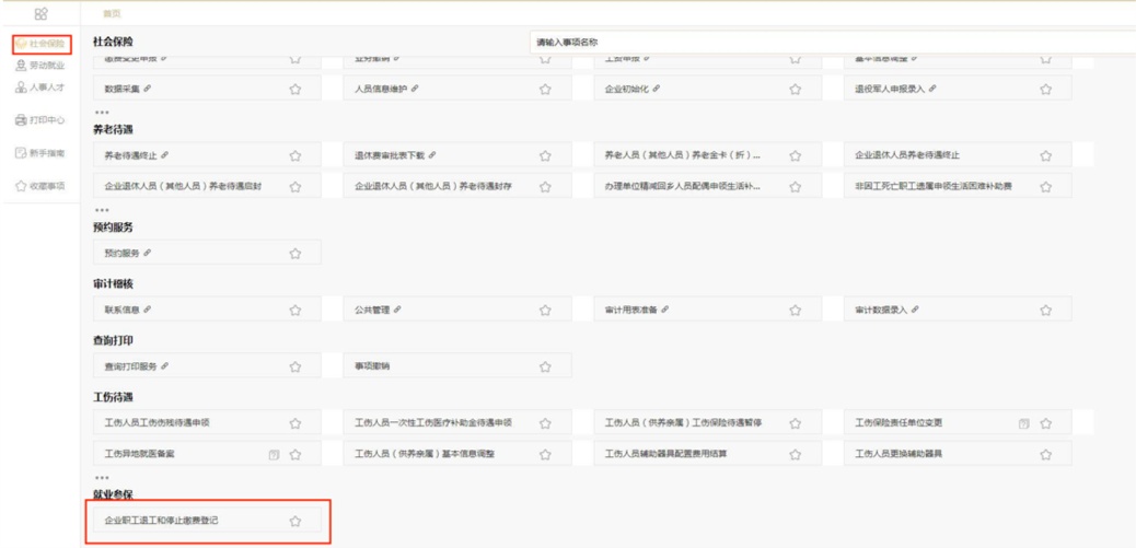 第一步:登录“上海市人力资源和社会保障自助经办系统”(网址:https://zzjb.rsj.sh.gov.cn/zzjbdl/),进入“社会保险(劳动就业)—就业参保—企业职工退工和停止缴费登记”栏目。