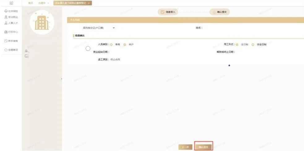 第二步:选择办理对象的证件类型,录入姓名和证件号码,点击“确认”,填写相关登记信息(您在“解除或终止日期”栏选择实际离职日期即可,并选择退工原因,其中“缴费截止年月”由系统生成),然后点击“下一步”。