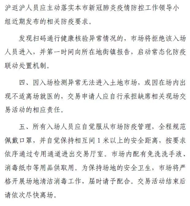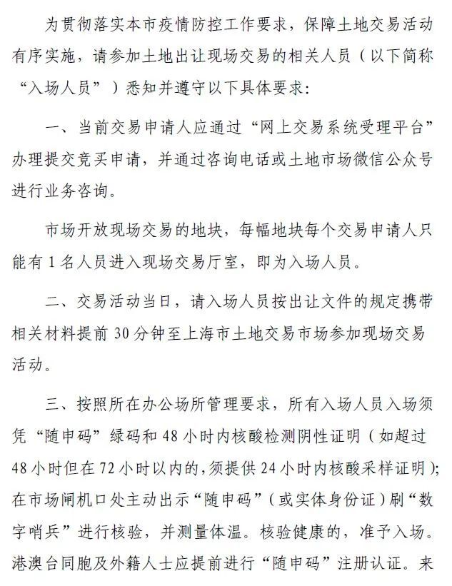 请上述地块竞买人根据地块现场交易会时间,按出让文件(具体详见出让须知第十二条第(三)款第2项)的规定携带相关材料提前30分钟至上海市土地交易市场参加现场交易活动。各竞买人须严格遵守《本市土地出让现场交易疫情防控须知》(见附件),每幅地块每个竞买人只能有1名人员进入现场交易厅室,因入场检测异常无法进入土地市场,或因在场内出现不适离场就医的,竞买人应自行承担缺席相关现场交易活动的相应责任。