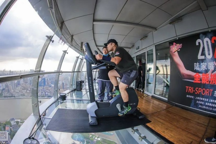 今年TRI-SPORT系列赛从9月初开始举办,更加强调景观体育的概念。继第一站赛事落户上海环球金融中心举行后,第二站比赛来到上海城市地标之一——东方明珠电视塔,并在259米全透明悬空走廊上搭建比赛场地。赛事为期两天,成为考验不少参赛者心理素质的“心跳之战”。