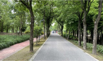 以“骑行+跑步道”组合绿道的形式形成园内主园路骨架,增加标识标牌、驿站、LOGO景墙等,同时增补四化植物,提升沿线绿化景观,打造环上休闲绿道。