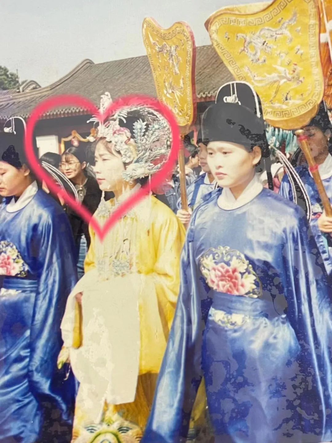 照片中,华丽高贵的“元妃”,带着一众“侍卫”,在园内前行。在“元妃”和侍卫中间,露出一个小脑袋,架着眼镜,深深的酒窝,掩饰不住内心喜悦的扎马尾的少女,就是我。