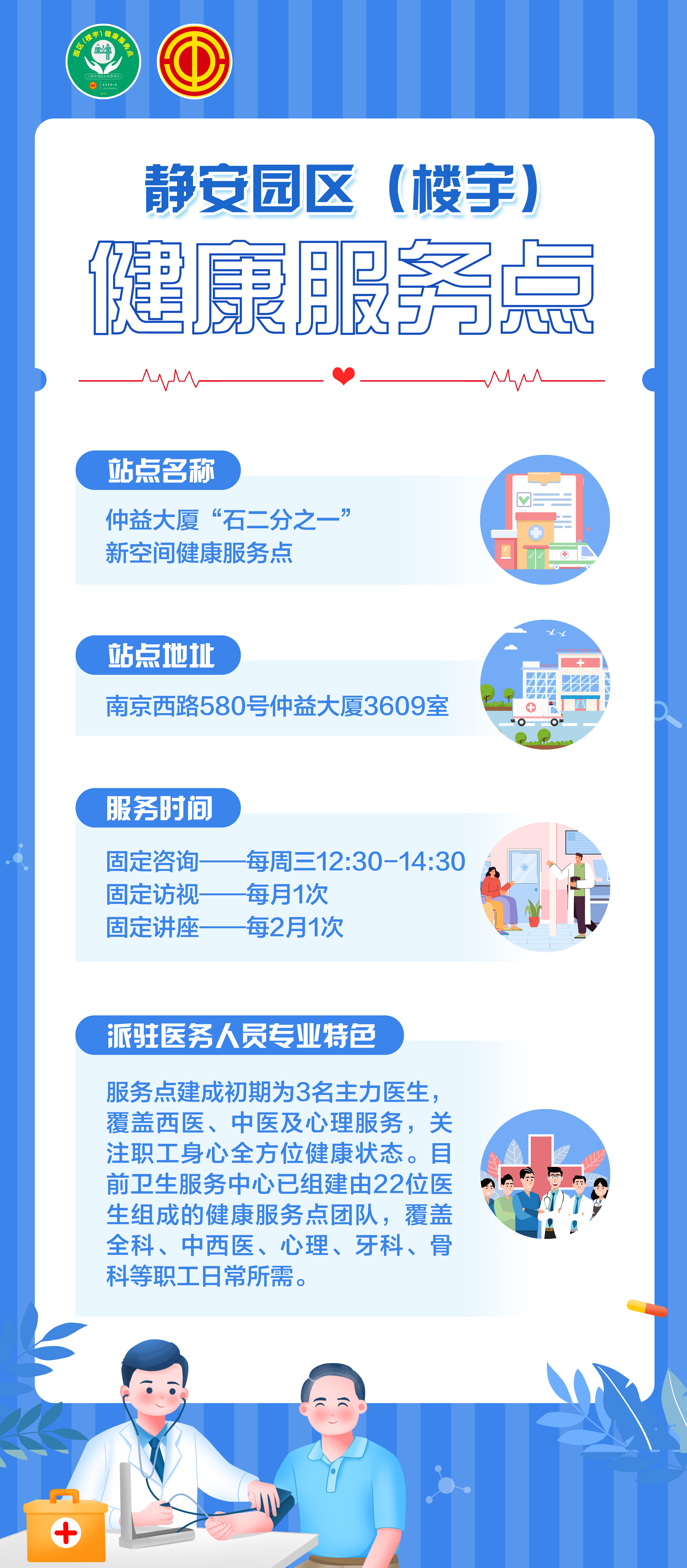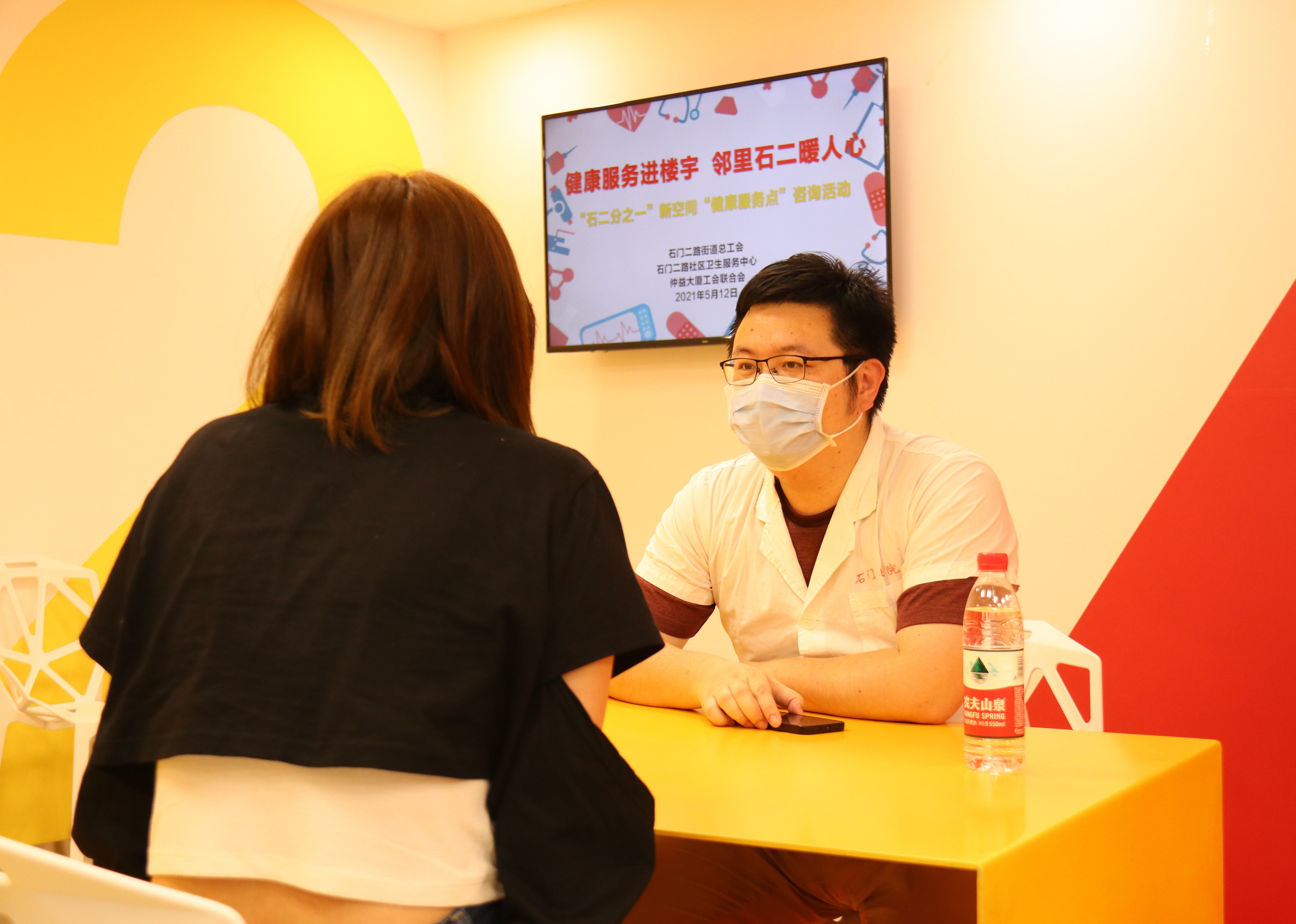 石门二路街道“石二分之一”新空间党群服务站职工健康服务点位于仲益大厦,2021年5月开始向楼宇白领提供健康服务。