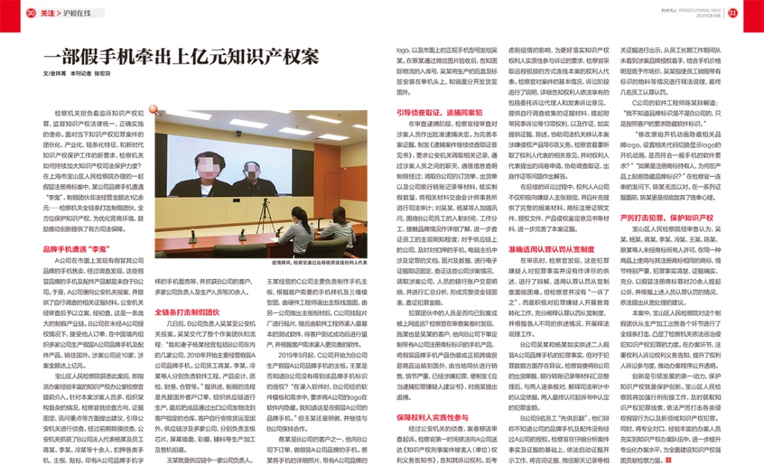 在上海市宝山区人民检察院办理的一起假冒注册商标案中,某公司品牌手机遭遇“李鬼”,制假团伙非法经营金额达1亿余元……检察机关全链条打击制假团伙、全方位保护知识产权,为优化营商环境、鼓励推动创新提供了有力司法保障。