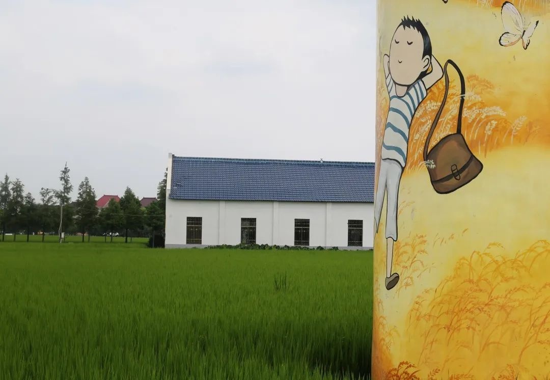 在安亭镇向阳村的碧波稻浪里,藏着一座漂亮的烘米厂。远远的,就能看见烘米厂的外墙上有一个大大的心形。在心形的旁边则绘有童趣满满的稻穗和鸟儿,与远处的稻浪、空中的飞鸟,相映成趣。