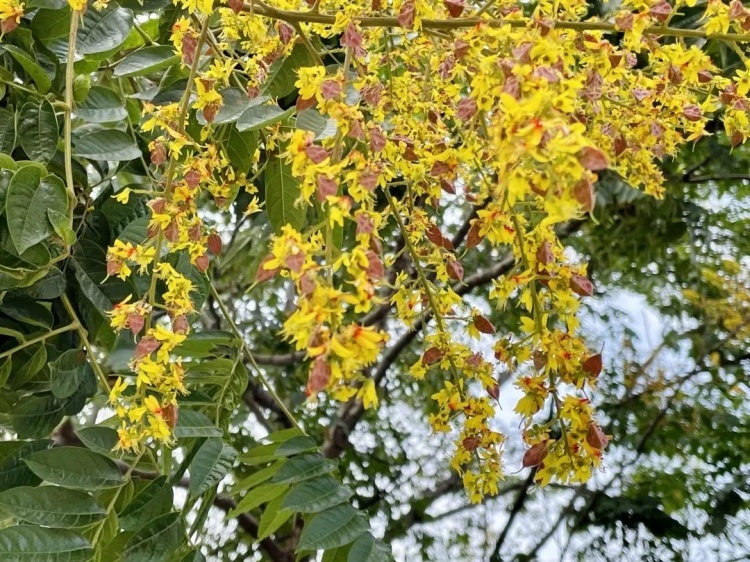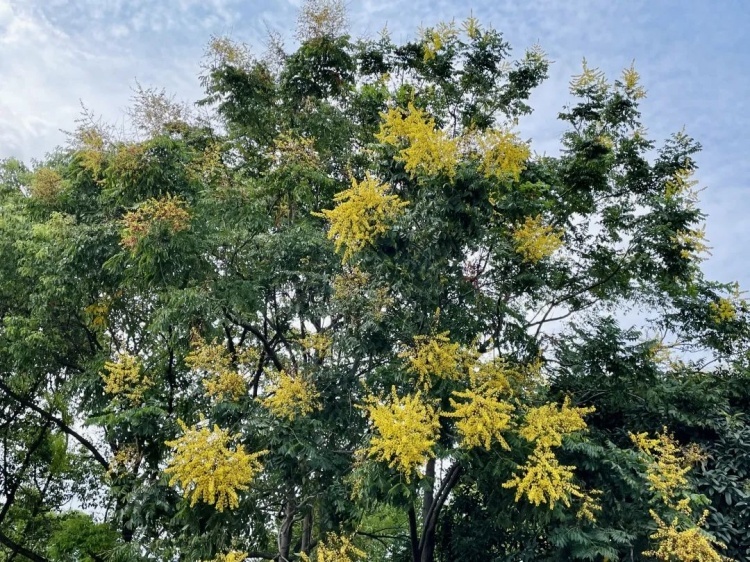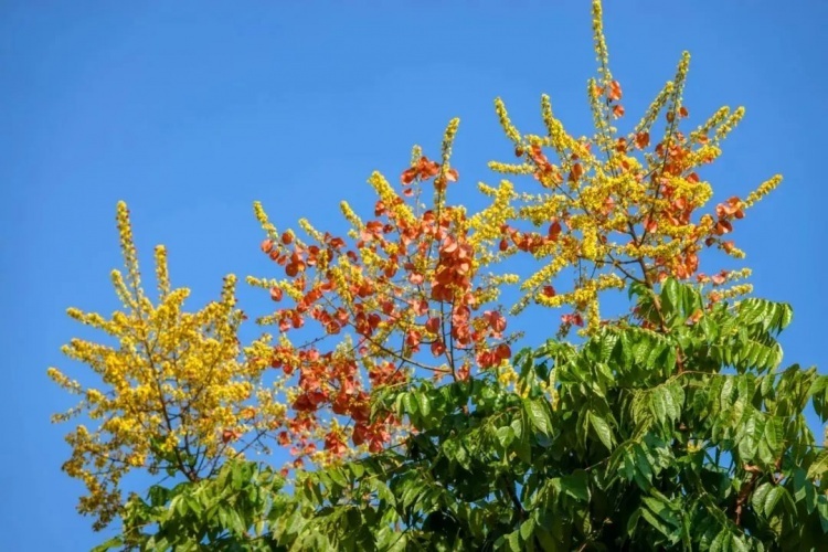如今,栾树正值花期,那小花虽细碎如米却别具一格,花瓣向外反折似蝴蝶翩飞的翅膀,花蕊从花芯中挺立而出,基部的橙红与黄色形成强烈的对比,宛如燃烧的“小火苗”。