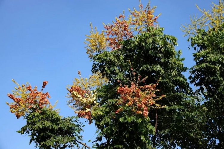 复羽叶栾树生长迅速,春季嫩叶红色,夏秋满树金黄,秋季蒴果泛红,绚丽多姿,惹人喜爱,常用于庭园观赏。