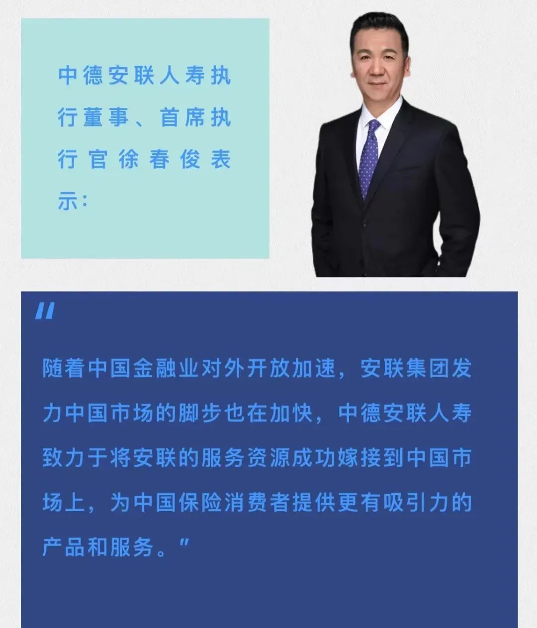 近日,中德安联人寿保险有限公司(下称“中德安联人寿”)正式宣布,公司已完成股权变更登记,企业类型正式从中外合资公司变更为外国法人独资公司,中德安联人寿执行董事、首席执行官徐春俊先生正式成为公司法定代表人。