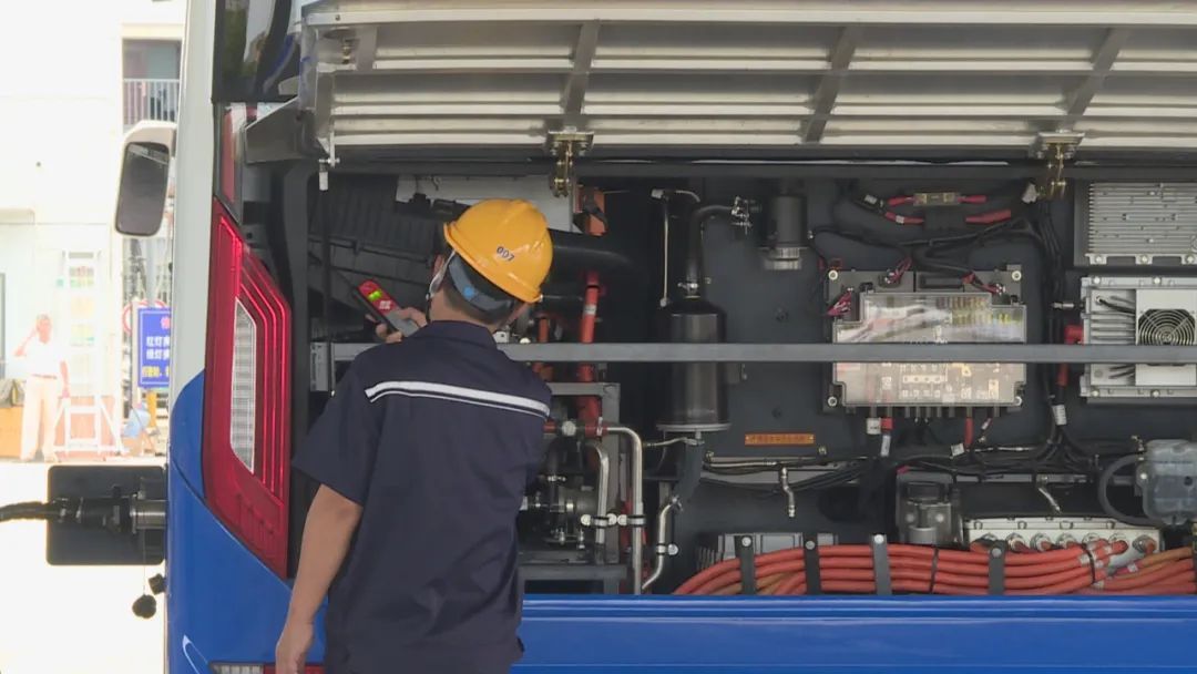 上午,在金海公路的上海奉贤巴士公共交通有限公司停保场内,驾驶员王耀稳稳地将氢燃料电池公交车停在了加氢站前的预检点。加氢站工作人员立刻上车核对车辆信息,并拿着检测仪开始对车辆里外进行全方面检查,确保公交车处于安全的运行状态。随后,王耀再将车辆缓慢行驶到站内加注位置,由工作人员对公交车进行加注。而在加注的同时,加氢人员严格遵守制度,对车辆不间断进行检测,确保现场环境安全。