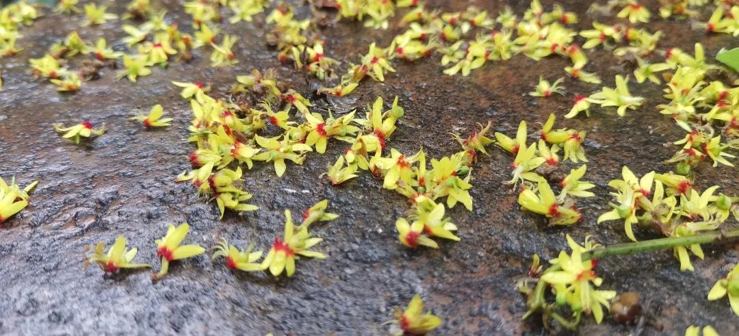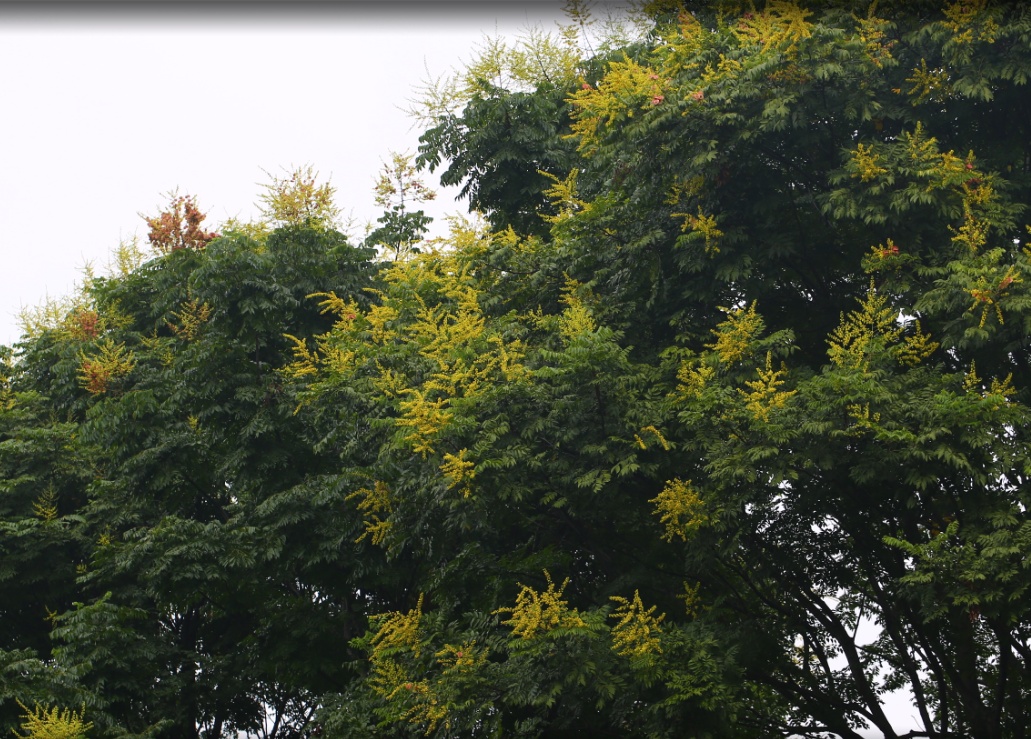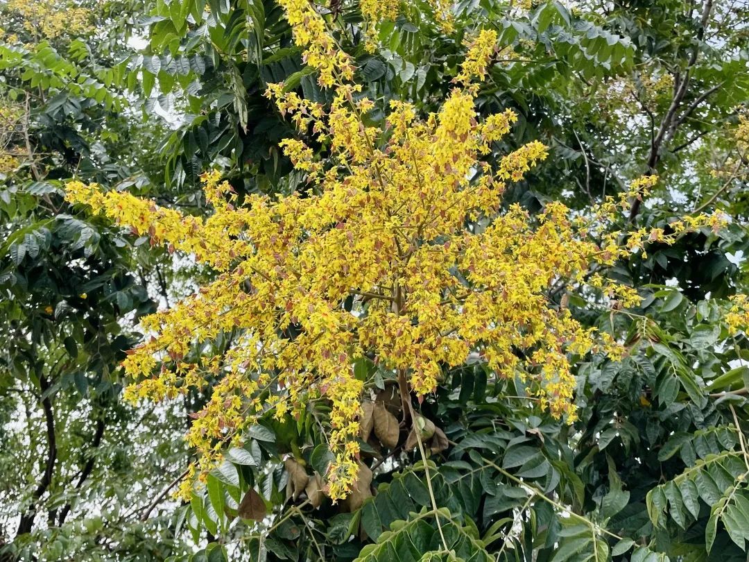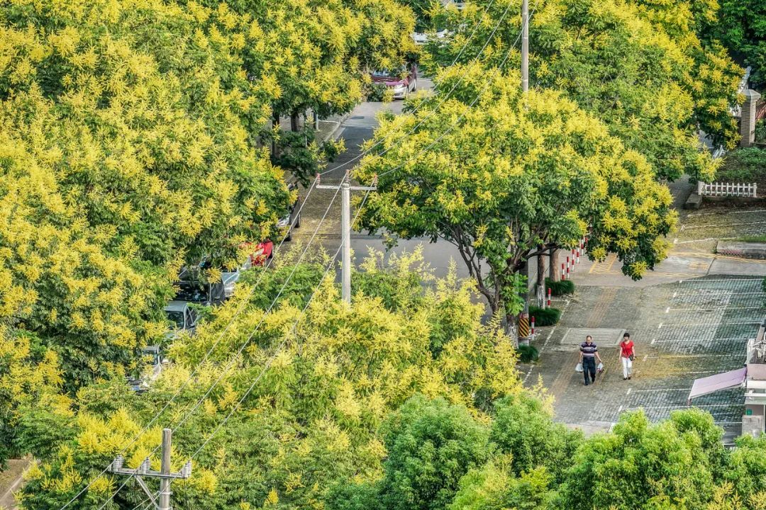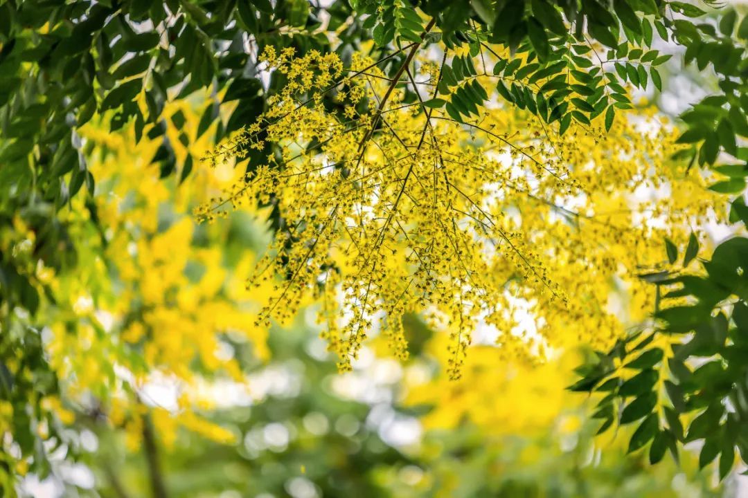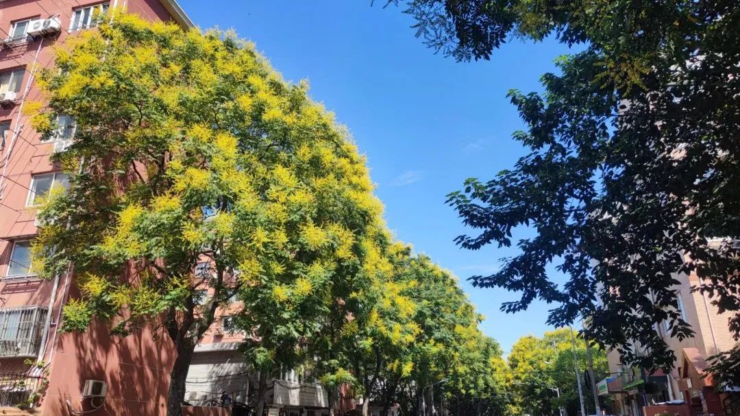 如今,栾树正值花期,那小花虽细碎如米却别具一格,花瓣向外反折似蝴蝶翩飞的翅膀,花蕊从花芯中挺立而出,基部的橙红与黄色形成强烈的对比,宛如燃烧的“小火苗”。