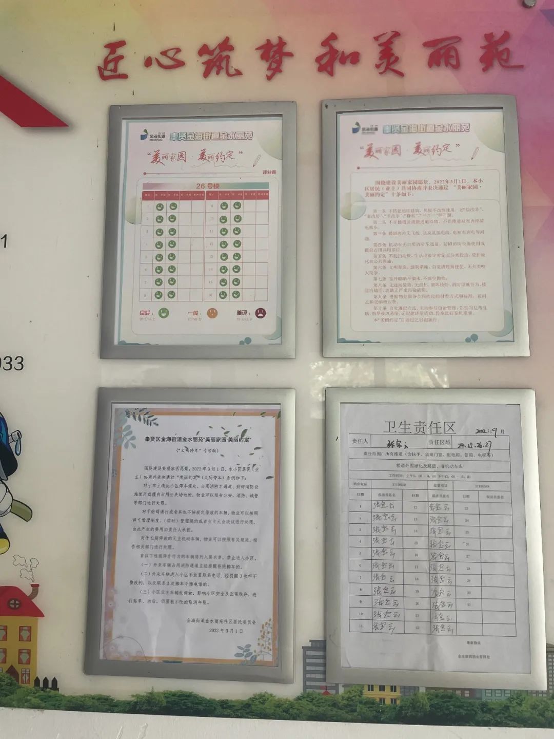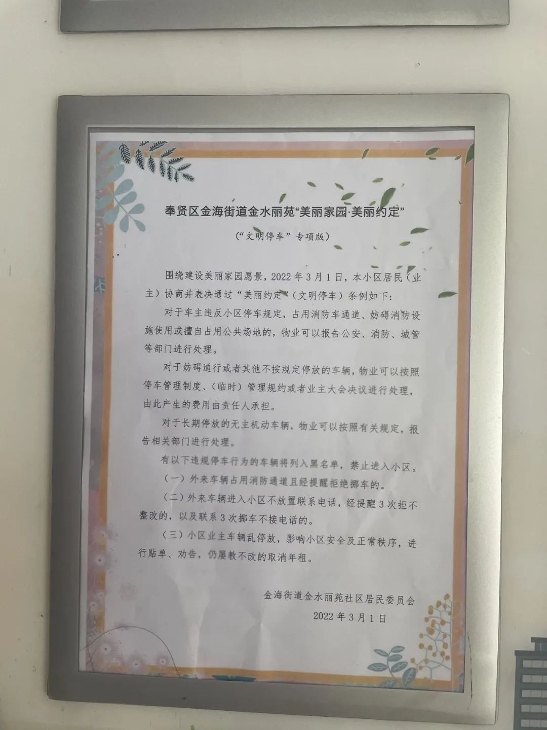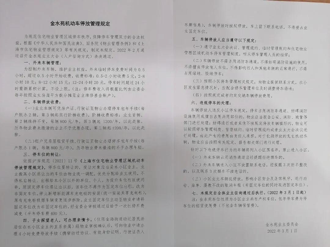 依据“尊重历史、兼顾现实、优化未来”的原则,制定相应的规范管理规则。金海街道3个拆迁小区通过居民意见征询,制定了新停车管理办法和细则,调整停车收费标准。同时,金水丽苑通过“文明停车美丽约定专项版”软约束、“张贴告知单+公示栏警告+禁入黑名单”、对未按规定停放的车辆采取二次收费等硬措施,多措并举,减少乱停车现象,改善秩序,为小区安全保驾护航。