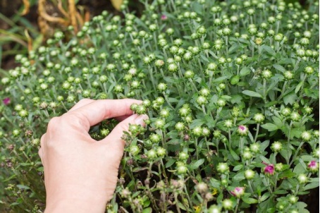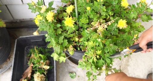 为控制菊花高度以及促进分支的生长,盆栽菊需进行摘心,摘心次数根据生长情况进行调整,7-8月后挺直摘心。