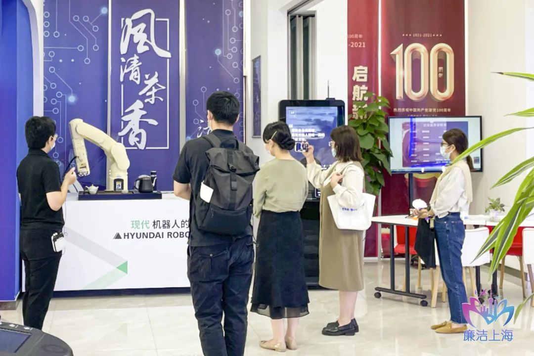 闵行区加强园区廉洁文化建设,不断创新载体形式。该区马桥镇打造“AI+廉洁文化”模式,在“马桥有AI”党群服务站建立“清廉驿站”。图为园区党员正在体验AI清风智能茶吧、聆听AI清风播报。(闵行区纪委监委供 肖琳妹 摄)