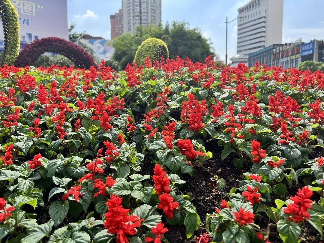 在四平路地铁站2号口,有一处环形花坛,其花卉图案主要由一串红、孔雀草组成,红与黄的色彩交织在一起,十分亮丽。不少路过的市民会驻足打卡拍照,路人表示,这里的花卉常换常新,每次都有不一样的感官享受。