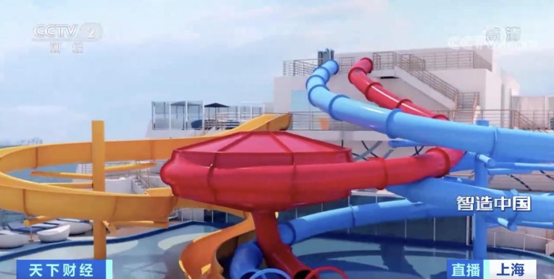 现在的大型邮轮不仅能满足住的需求,还有多样化的娱乐活动。比如露天甲板就有很多的户外娱乐设施,未来这片区域会成为一个水上乐园,今年年底会完成滑道的安装,届时乘坐滑梯就可以进入下层甲板了。