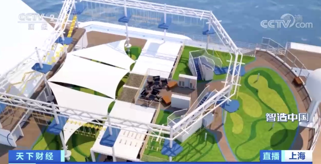 整个甲板上还有一个绿色区域,是球迷观影的地方。这里还有一个三合一的球场,船尾还有露天泳池。