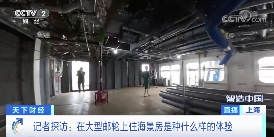 很多人关心,在船上到底住得怎么样?乘客要居住的舱室,目前还是毛坯房的样子,天花板上的电线电缆已经完成了铺设,目前正在安装新风管道和空调管道,随后就可以铺设地板、设置家电和家具,在这个舱室里景观非常好。