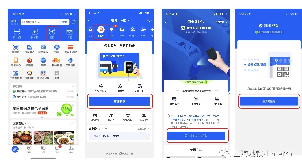(1)开通乘车二维码步骤乘客可在支付宝中点击出行切换至地铁,完成领卡、用户注册流程后即可生成地铁二维码(详见下图)。