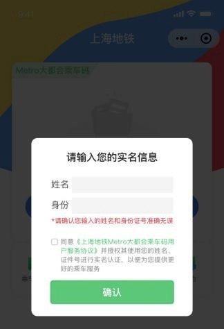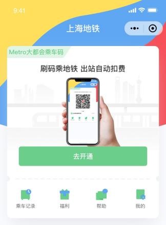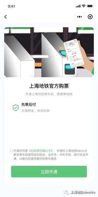 (1)开通乘车二维码步骤在微信小程序中搜索“上海地铁Metro大都会乘车码” ,进入“上海地铁Metro大都会乘车码”小程序。用户点击【去开通】按钮,依据页面提示,授权微信绑定手机号,授权成功后在弹窗中输入本人姓名、身份证号,完成地铁实名信息认证。并进入开通微信免密支付流程,输入支付密码完成验证后,即可使用地铁二维码乘车功能(详见下图)。