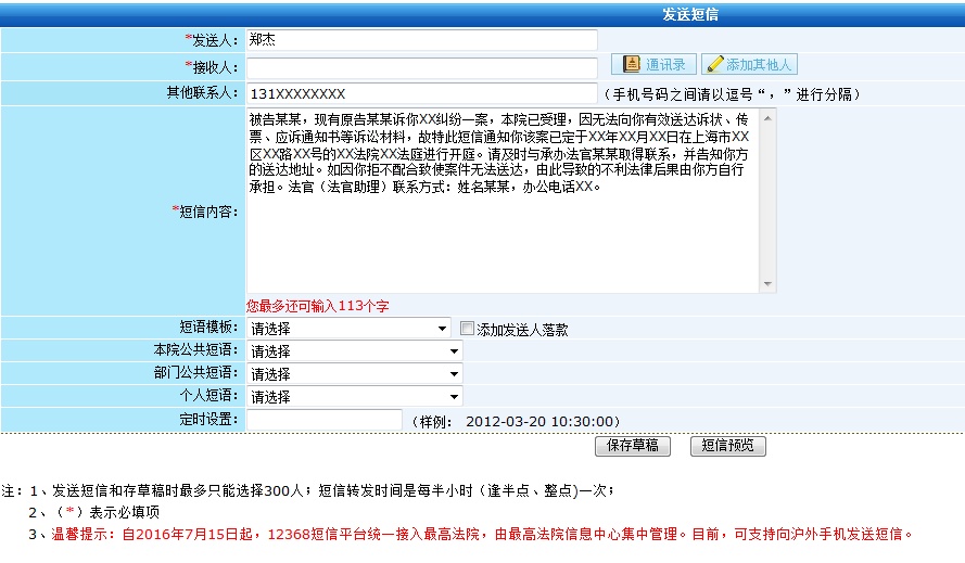 被告的手机号码可以打通,但一直是无人接听或拒绝接听状态,这时法官可以借助上海法院12368诉讼服务平台,通过短信服务平台,向被告发送如下短信: