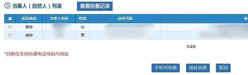无论是正式立案的诉讼案件,还是正在诉前调解阶段的案件,上海法院审判管理系统“当事人及其他诉讼参与人”页面均有“当事人信息协查”功能,可以通过通讯公司及邮政公司协助调查、获取当事人的手机号码和联系地址。