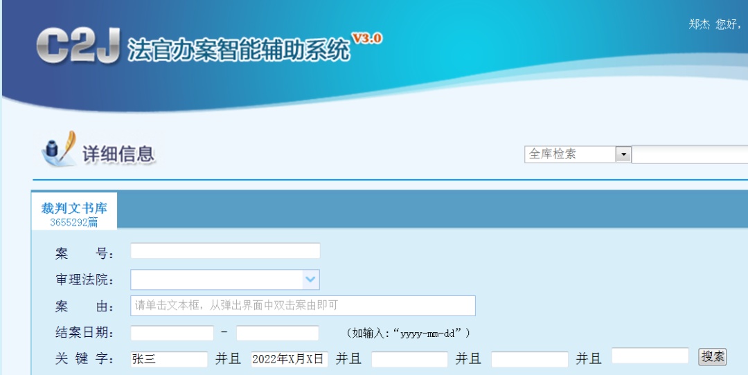 打开“C2J法官办案智能辅助系统”,在“裁判文书”页面内输入被告的姓名及出生年月日等作为关键词,即可搜索被告在本市各级法院有无其他案件,从而寻找被告的联系方式。