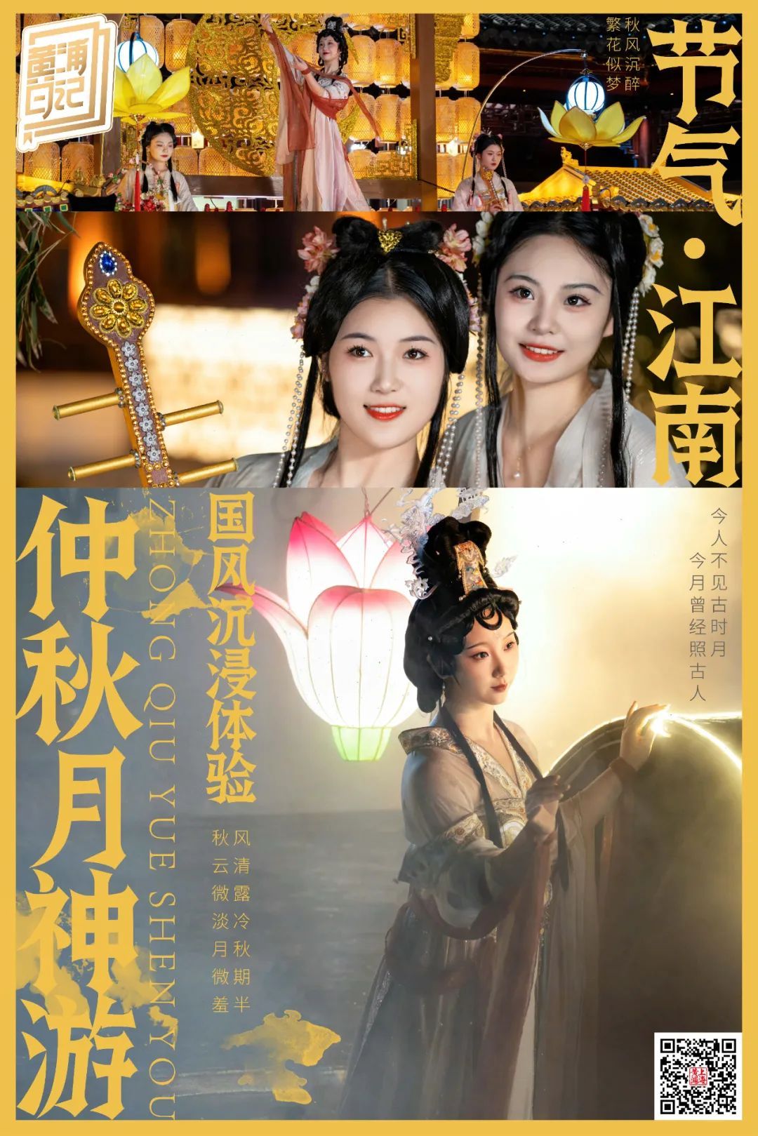 “仲秋月神游”结合节气民俗、非遗内容,讲述一段月神下凡赏秋景、品秋色的浪漫故事,串联起《叶红桂香》《草木金芒》《白露点翠》《水调歌头》《秋社颂稻》《纤云弄巧》六大沉浸式互动场景。