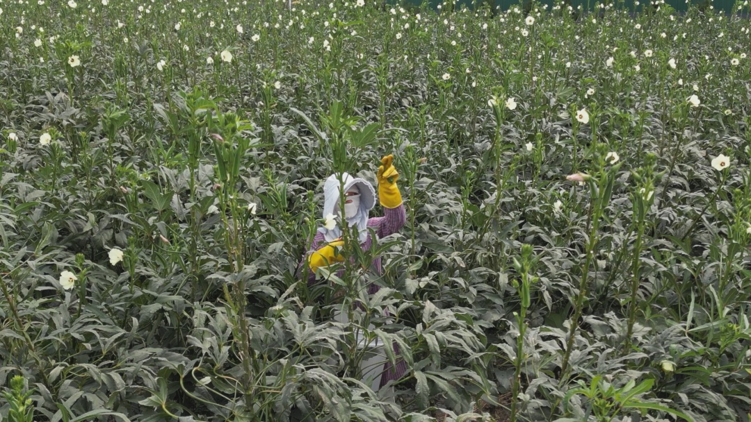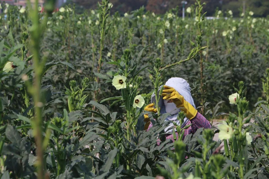 工人灵活穿梭在一人多高的秋葵地里,手起剪落间,便将长在枝头、尺寸合适的青翠果实采下,没过几分钟,竹篮便装满了。