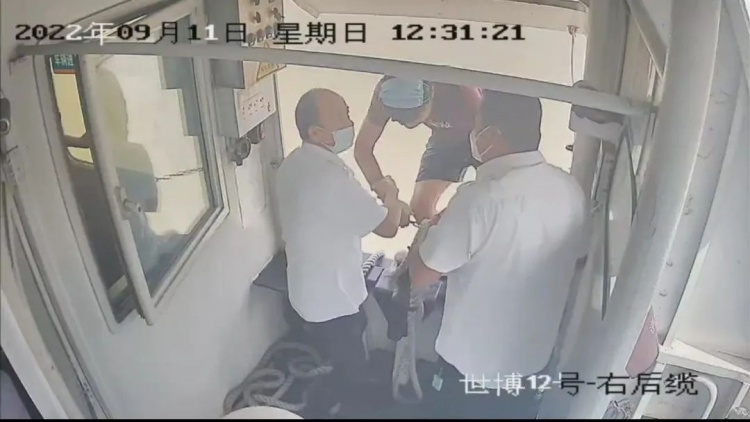 同时,渡船驾驶室接到越界警报,当班驾驶员立即停船,启动应急救生预案,组织指挥当班一名水手紧急救援,将缆绳抛向落水乘客,合力将其安全拉上渡轮,另一名水手维护好现场秩序稳定,安抚好其他乘客情绪。从12时30分15秒发现有人落水,到12时31分20秒时成功把人救上来,仅仅用了65秒。